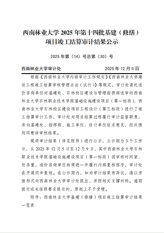 西南林业大学2025年第十四批基建(修缮)项目竣工结算审计结果公示