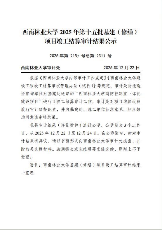 西南林业大学2025年第十五批基建(修缮)项目竣工结算审计结果公示