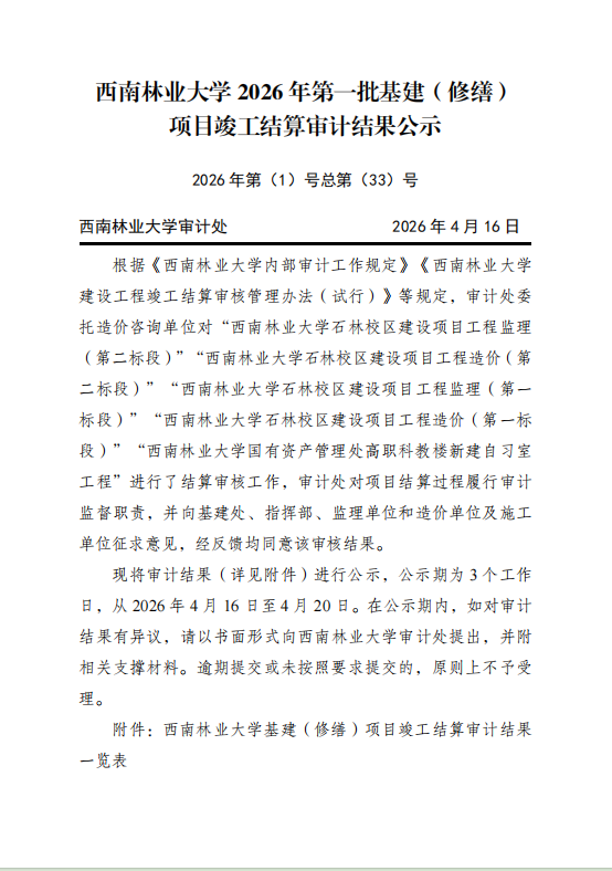 西南林业大学2026年第一批基建(修缮)项目竣工结算审计结果公示